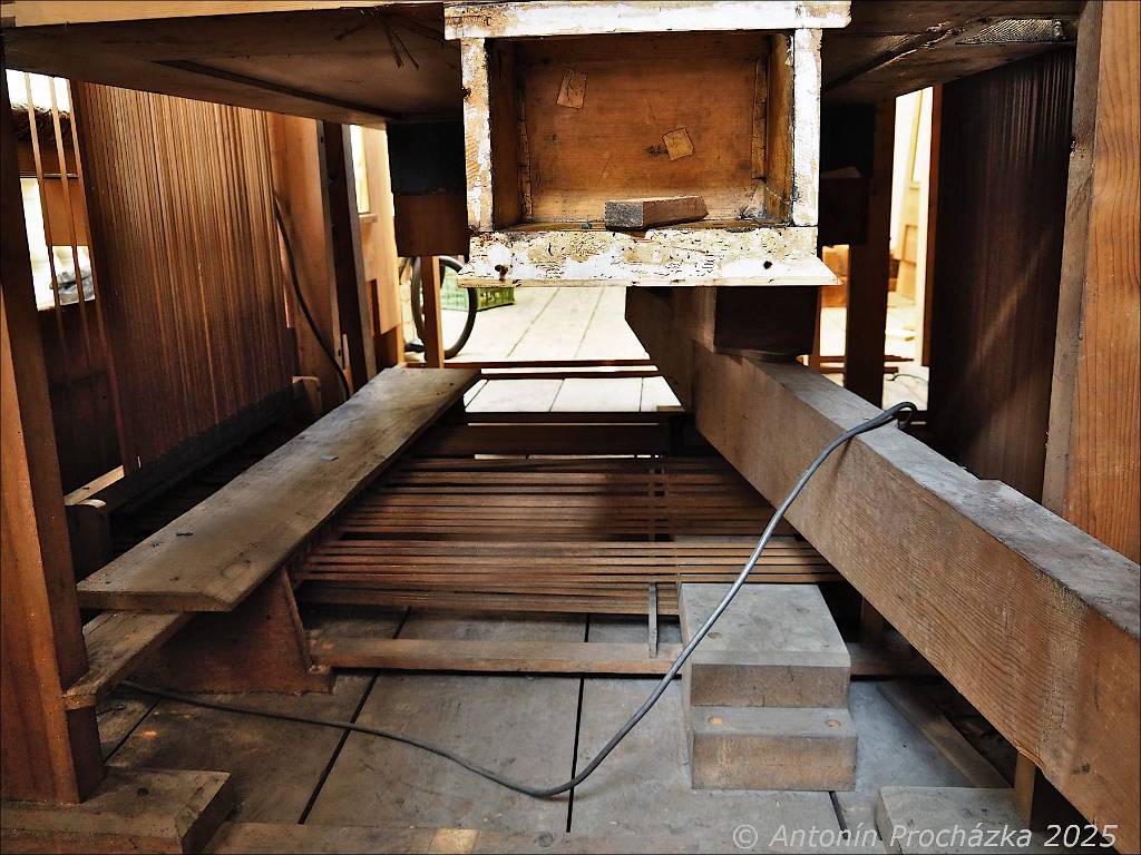 Ivanovice na Hané, kostel sv. Ondřeje. V pondělí 15. září 2025 začala práce na opravě, čištění a naladění varhan. Na pravé straně je páka, která slouží k stlačování (čerpání) vzduchu do měchu. Člověku, který obsluhuje měchy, které vhánějí vzduch do varhan, se říká kalkant. | ![]() |