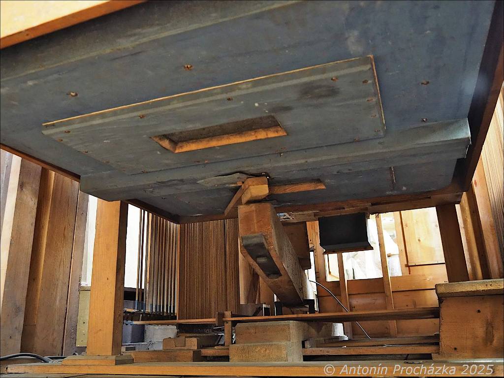Ivanovice na Hané, kostel sv. Ondřeje. V pondělí 15. září 2025 začala práce na opravě, čištění a naladění varhan. Zde je pohled na páku, která slouží k stlačování (čerpání) vzduchu do měchu z druhé strany. Člověku, který obsluhuje měchy, které vhánějí vzduch do varhan, se říká kalkant. | ![]() |