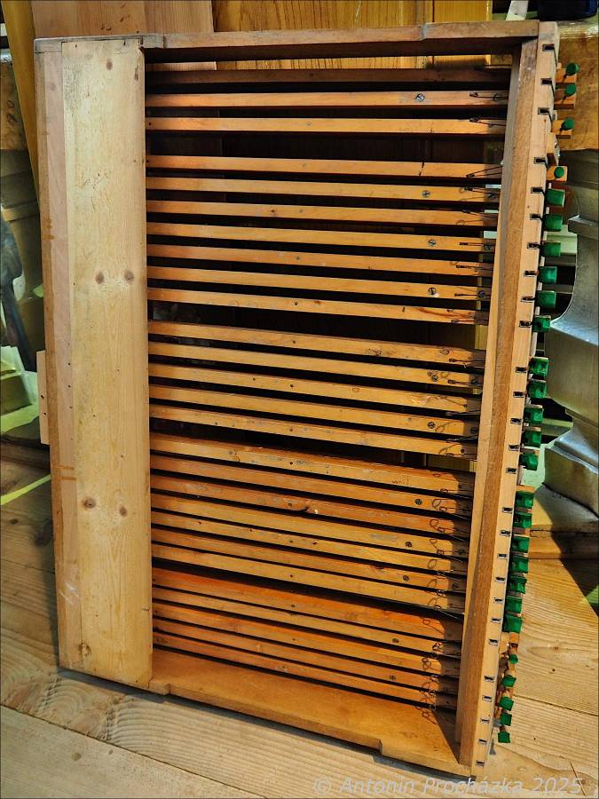 Ivanovice na Hané, kostel sv. Ondřeje. Varhanáři pokračují na opravě, čištění a naladění varhan. Zde je pedál z hracího stolu. Pedál (z lat. pes – noha) – klaviatura pro hru nohama. | ![]() |