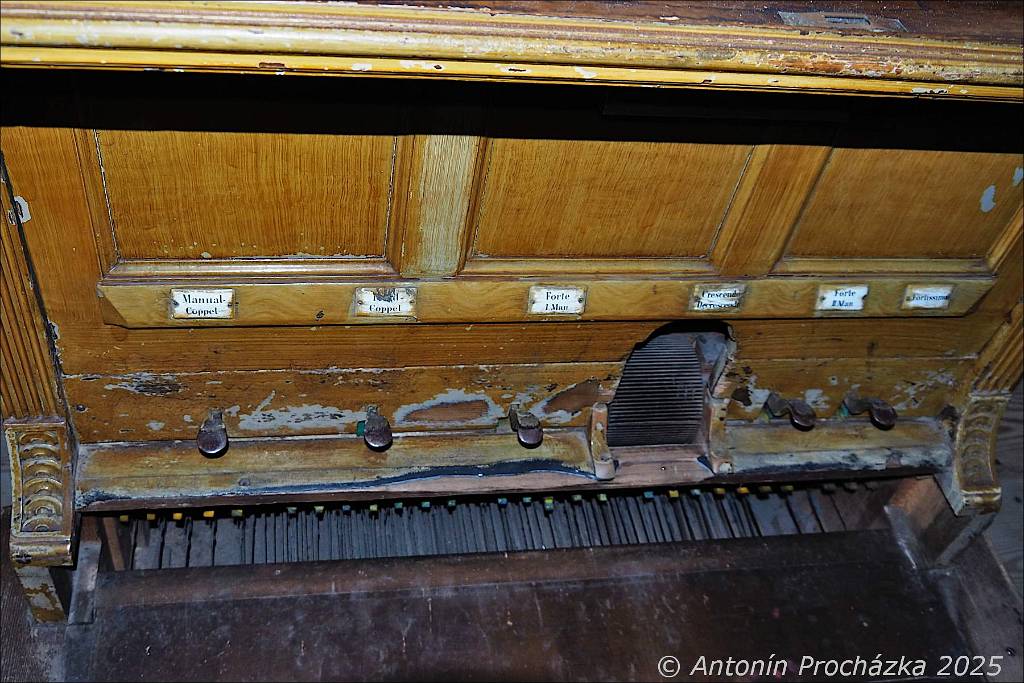 Ivanovice na Hané, kostel sv. Ondřeje. Varhanáři pokračují na opravě, čištění a naladění varhan. Spodní část hracího stolu, momentálně bez pedálu, pro hru nohama. | ![]() |