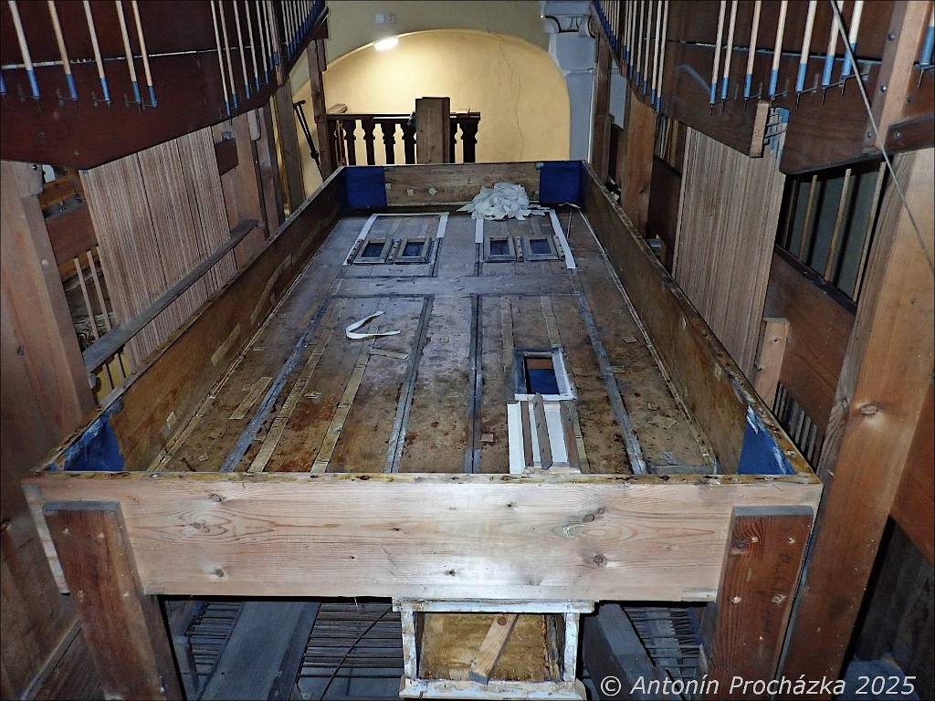 Ivanovice na Hané, kostel sv. Ondřeje. Varhanáři pokračují na opravě, čištění a naladění varhan. Pokračuje oprava měchu. | ![]() |