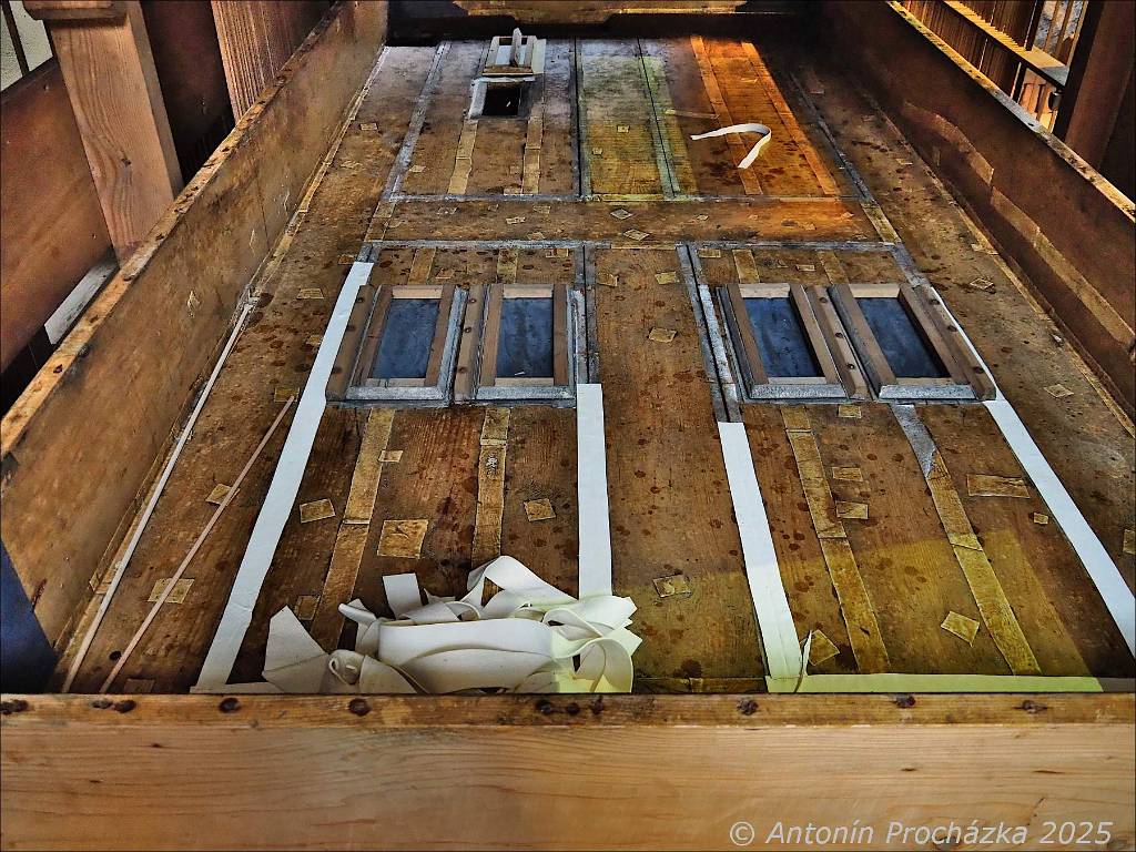 Ivanovice na Hané, kostel sv. Ondřeje. Varhanáři pokračují na opravě, čištění a naladění varhan. Pokračuje oprava měchu. | ![]() |