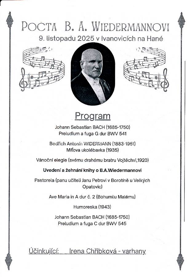 Ivanovice na Hané 9. 11. 2025 – Pocta B. A. Wiedermannovi – program.