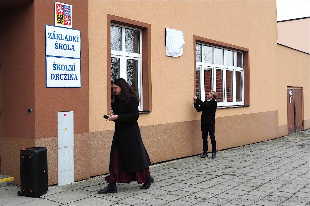 008_PB094544u.JPG - Ivanovice na Hané 9. 11. 2025 – Pocta B. A. Wiedermannovi. Slavnostní koncert s odhalením pamětní desky a požehnání knize o B. A. Wiedermannovi. Slavnostního odhalení pamětní desky na budově školy, kde se B. A. Wiedermann narodil, se ujal pan starosta Ing. Vlastislav Drobílek.