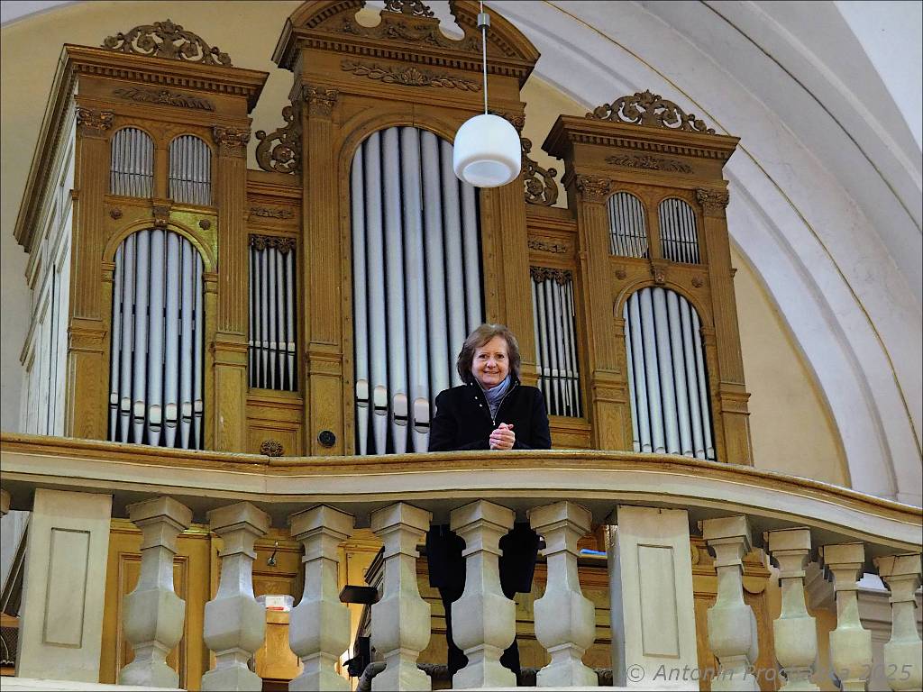 016_PB094561u.JPG - Ivanovice na Hané 9. 11. 2025 – Pocta B. A. Wiedermannovi. Slavnostní koncert s odhalením pamětní desky a požehnání knize o B. A. Wiedermannovi. Varhanice MgA. Irena Chřibková, renomovaná koncertní umělkyně, která působí v bazilice sv. Jakuba Staršího na Starém Městě pražském.