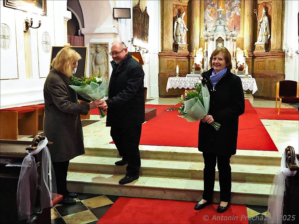 | Ivanovice na Hané 9. 11. 2025 – Pocta B. A. Wiedermannovi. Slavnostní koncert s odhalením pamětní desky a požehnání knize o B. A. Wiedermannovi. Pan Radek Masařík předává kytičky. | |